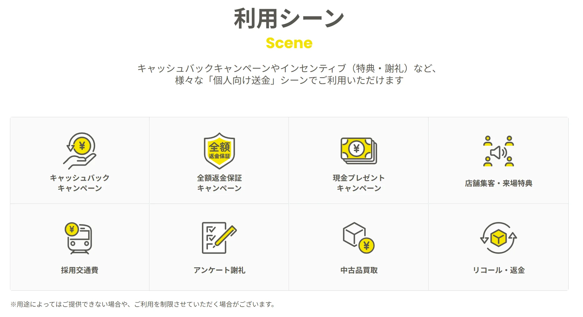 さらに返金業務だけでなく、キャッシュバックキャンペーンや全額返金保証、アンケート謝礼など、幅広い個人向け送金にも活用できます。